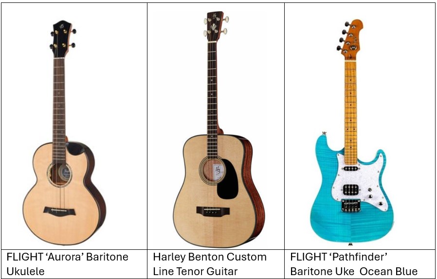 The Tenor guitar (4-string) is strung with metal strings and gives a metallic ring when strummed, while the Baritone Uke is strung either partly or entirely with Nylon so it has a softer mellow ‘woody’ sound. With metal-wound strings (lower 2 strings) the Baritone Uke can be quite loud with a lot of resonance. The resonance, volume and sweetness of tone depends on the actual quality build of the instrument. An instrument made with Solid Wood throughout will have more volume, more sweetness, more resonance, greater richness in sound than instruments made with laminate (layers of thin wood glued together). However, an instrument with a solid top with laminate sides and back is a good compromise.